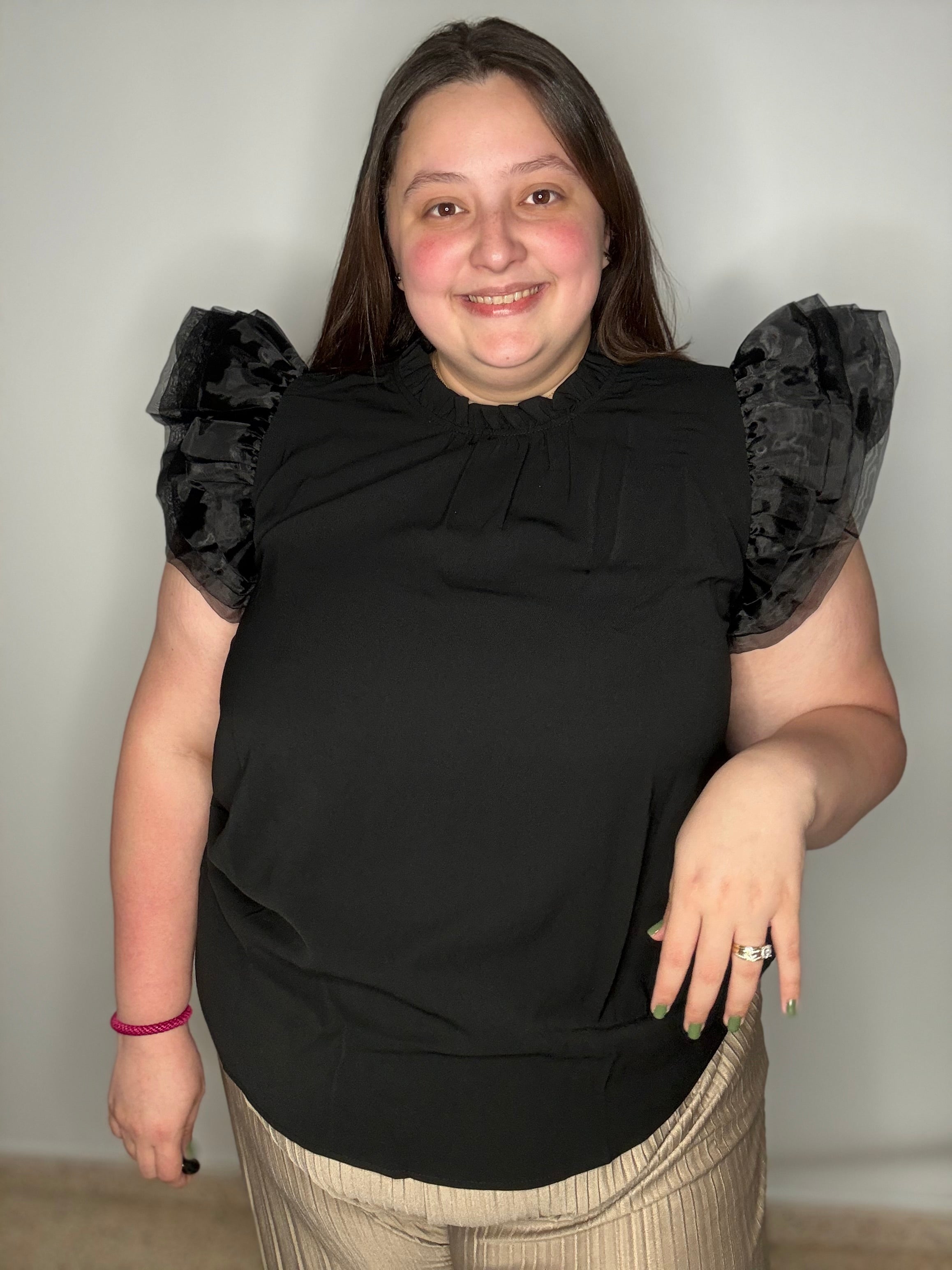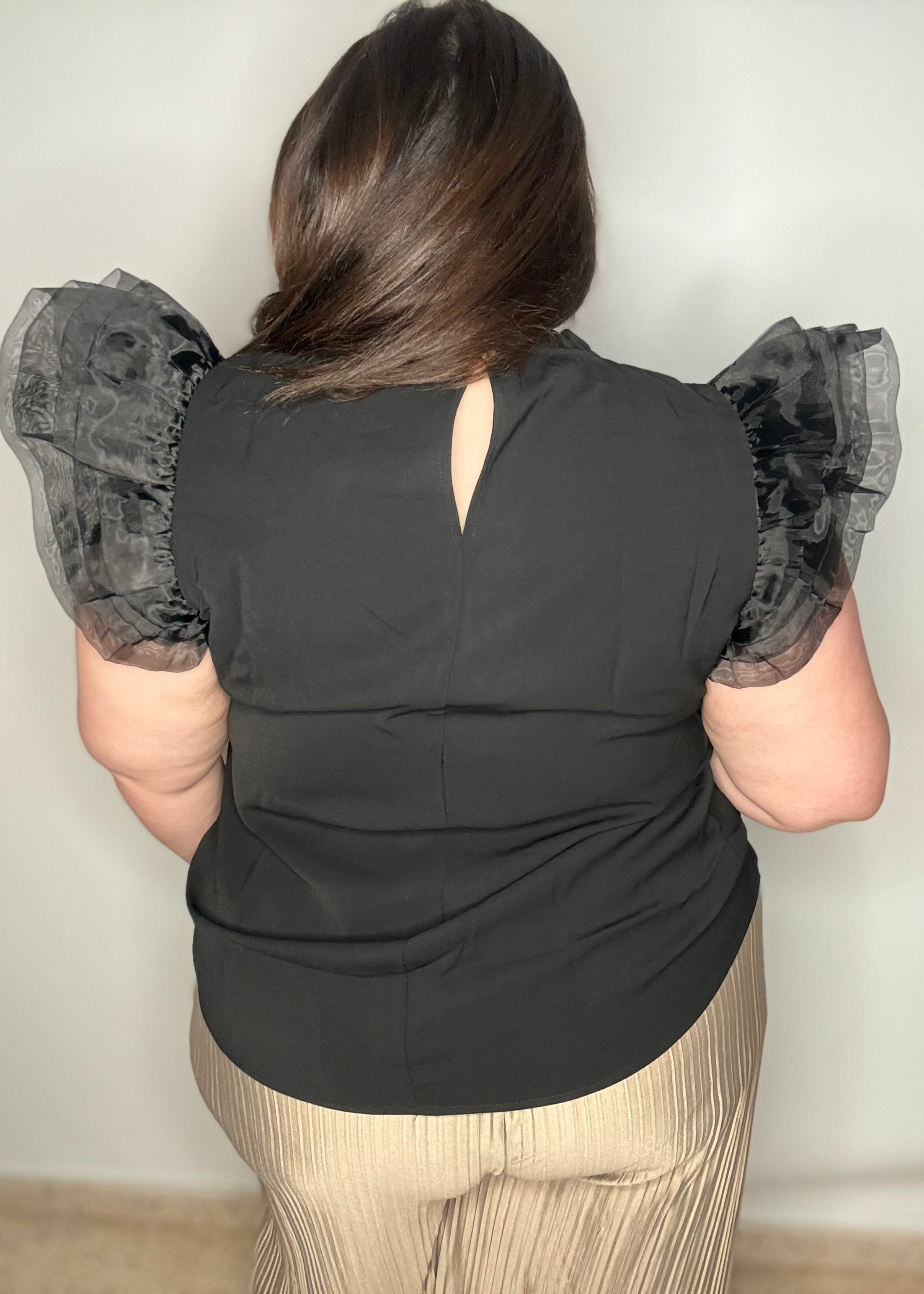 This luxurious organza black top seamlessly combines elegance and comfort. The solid design with a frilled neck and ruffled shoulder adds a touch of femininity. The back buttoned closure provides convenience while the non-sheer, lightweight fabric ensures a comfortable wear. Elevate your wardrobe with this exclusive piece.
