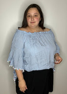 Blusa off-shoulder en un azul pastel hermoso, con mangas anchas y borde de mini pom-poms multicolor que le dan un toque divertido y veraniego.