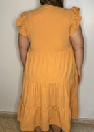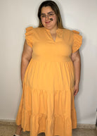 1 reseñaThis sunny tiered midi dress is a stylish option for any occasion. Crafted from a medium weight, non-sheer woven material, it features a flattering V-neck neckline, short sleeves with ruffle detailing, and pockets at the side. Perfect for a night out or special event, this dress will keep you looking chic all day.