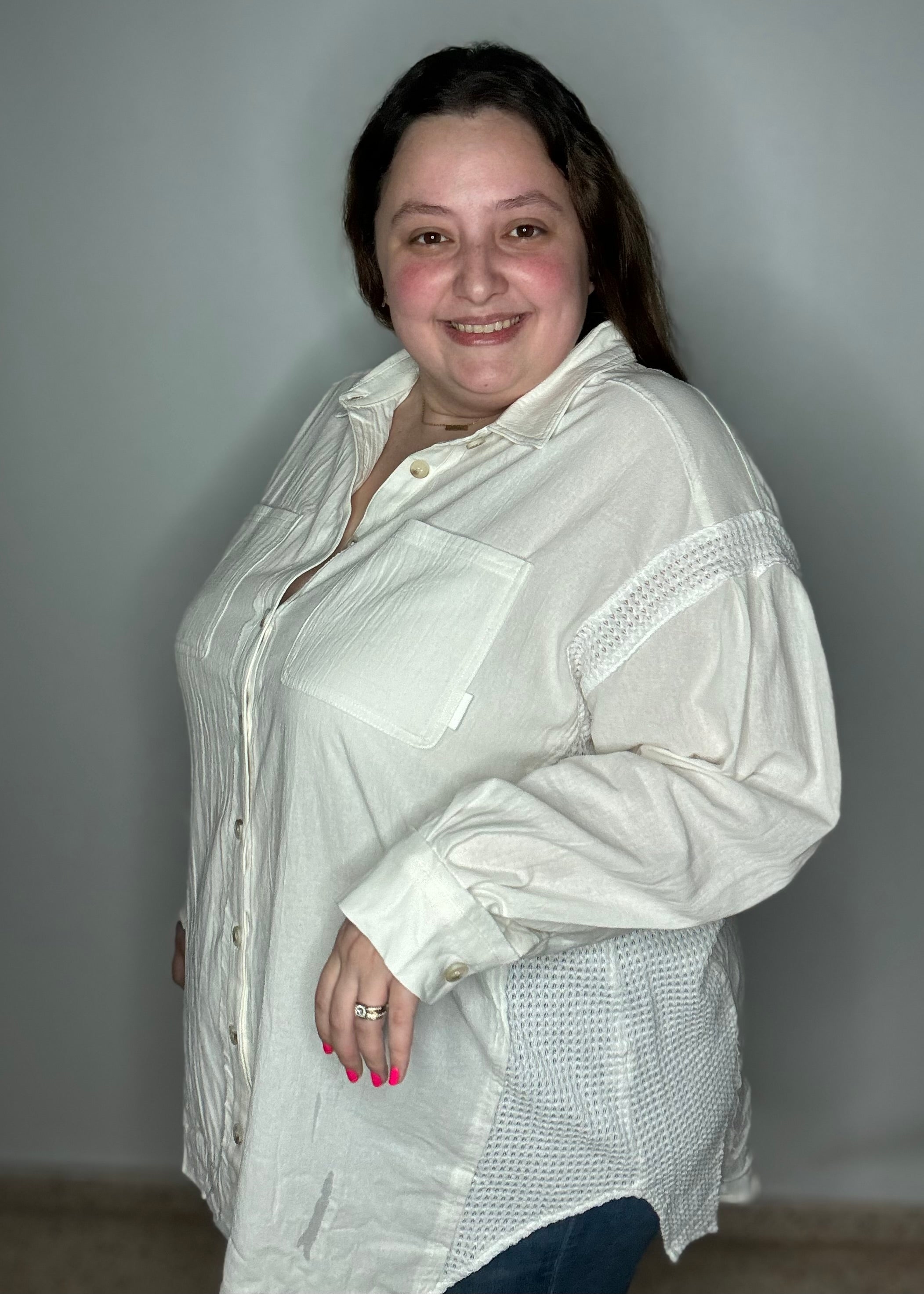Effortlessly elevate your wardrobe with our white button down shirt. Made from high-quality materials, this solid shirt features a classic button-down design with convenient pockets. Perfect for any occasion, add this stylish and sophisticated piece to your collection today.