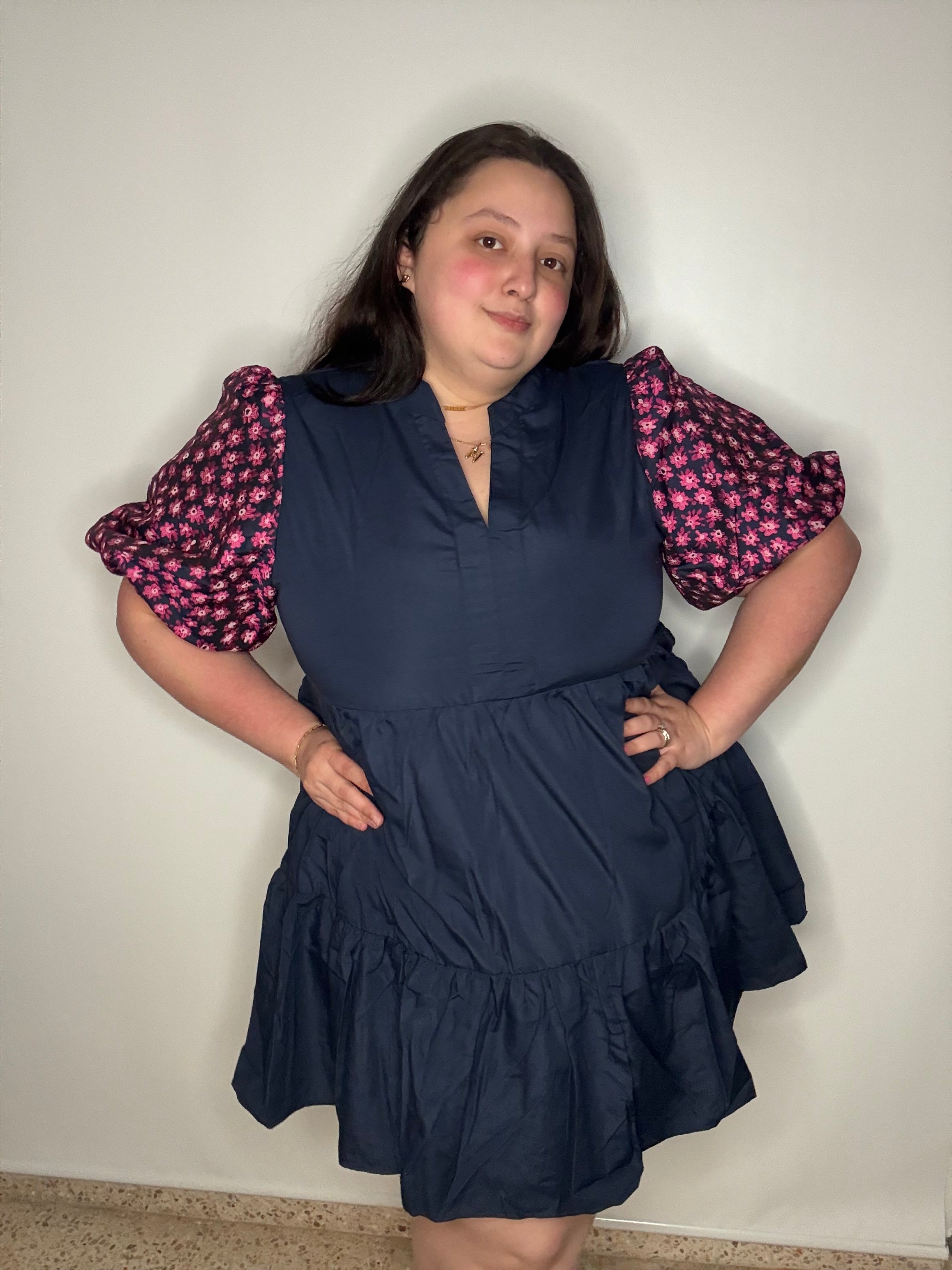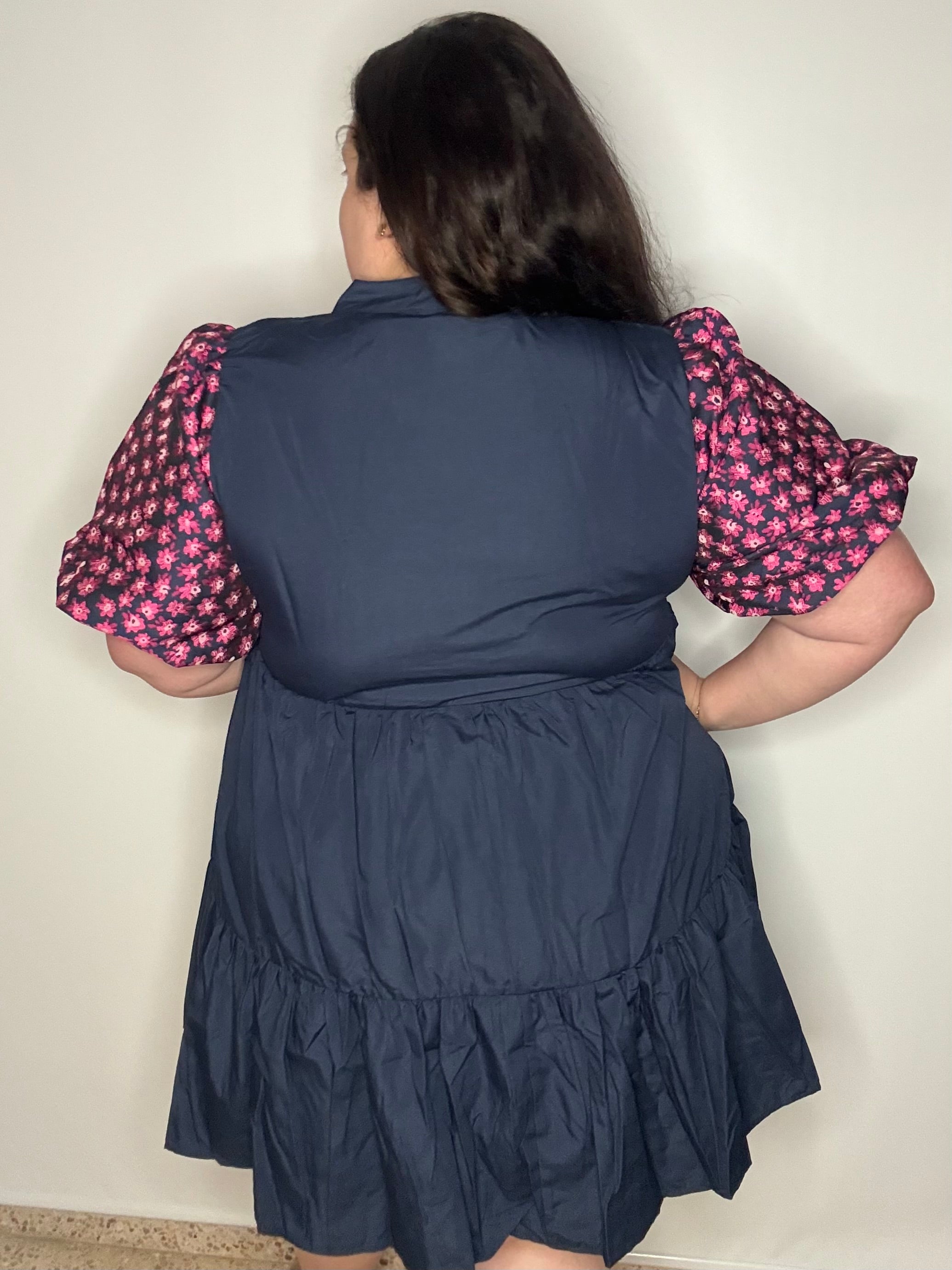 Get ready for adventure with this risk-taking mini dress! The solid v-neck and bubble sleeves add a touch of daring to your wardrobe, while the contrasting floral sleeve and tiered design provide a unique twist. Stay comfortable with elastic cuffs and side pockets, all while looking effortlessly stylish. Lined and lightweight, this woven dress is perfect for any occasion.