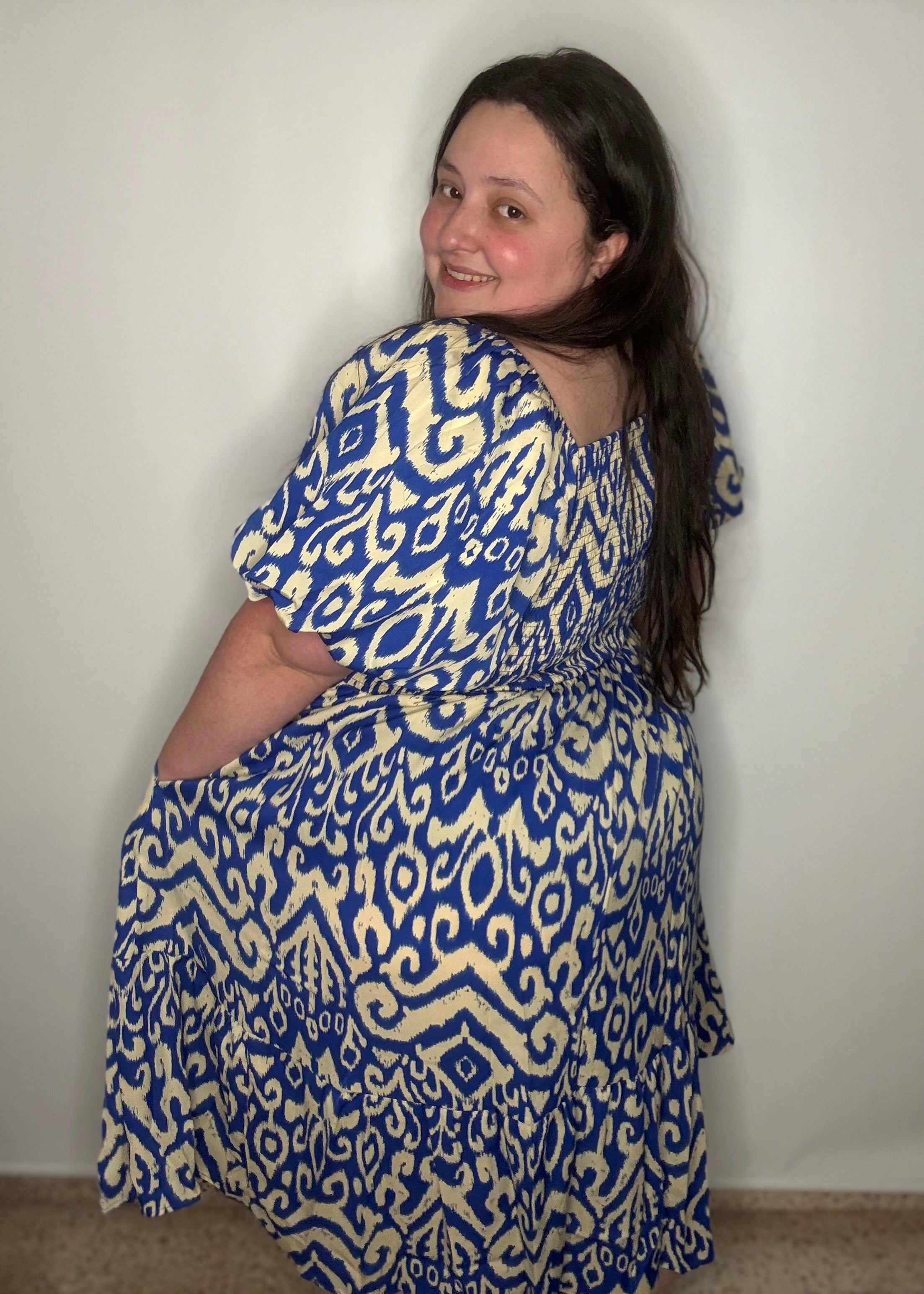 Expertly designed with a geometric print and flattering square neck, the Blue Pamela Midi Dress is a must-have addition to your wardrobe. The smocked bodice and tiered layer offer comfort and style, while the short puffed sleeves and side pockets add functional details. Elevate your look with this versatile and chic dress.