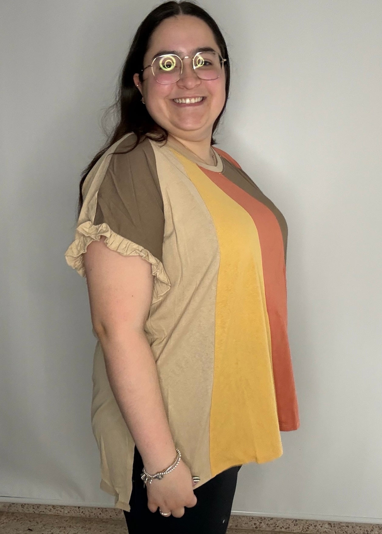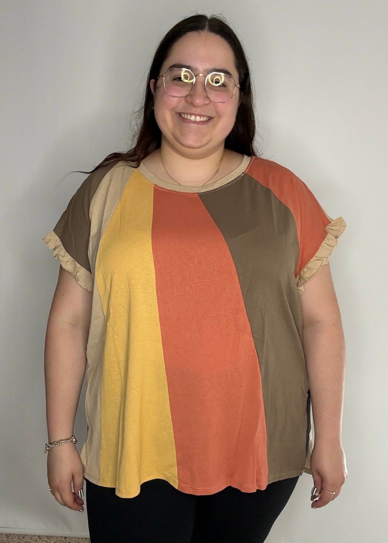 Elevate your style with our Rainbow Ruffle Blouse. This plus-size, lightweight knit top features a colorful and playful colorblocking design, along with charming ruffle details on the short sleeves. Perfect for layering or as a stand-alone statement piece, this cover-up top adds a touch of sophistication to any outfit.